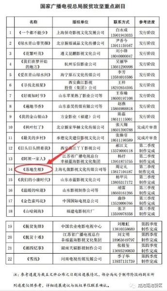3月17日,国家广播电视总局公布了22部脱贫攻坚题材重点电视剧剧目名单,由威海南海新区管委、山东卫视传媒、上海礼傲影视文化传媒、涅磐文化传媒(上海)、山东屹能市政工程联合出品的电视剧《落地生根》名列其中。