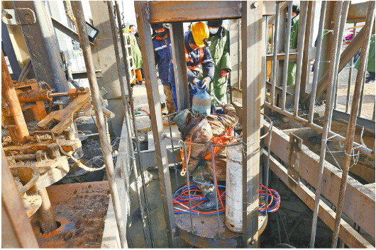 12日凌晨,记者在现场看到,钻井架下,一队工作人员通过钻机将一节节钻管伸入井下。一节钻管刚好3米,工人一分钟就可以安装一节。另一队在切割、焊接,火花四射,一个新的罐笼已经初具雏形。