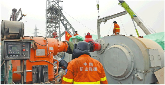 两次爆炸对回风井内的排水管路、电线电缆、钢丝绳、管道梁、梯子间隔板等造成了巨大的破坏。尤其在距井口350米处,大量障碍物层层挤压,盘根错节,清障一度受阻。指挥部及时优化方案,改用双层吊盘作业,加快了进度。清障工作组特别是井下施工人员,心里想的就是“救人、救人、救人”。他们克服天气冷、粉尘大、水量多、施工强度大等困难,不断改进作业方式,积极优化作业班次,全力抢时间、抢进度。在清理到380米处时,清障人员突然发现障碍物下有空洞,指挥部又及时调整清理策略,在确保井下施工人员安全的情况下,把影响吊盘下放的约20吨大块障碍物进行了就地固定,不再提升到地表,减轻了清理量,清障速度实现突飞猛进。